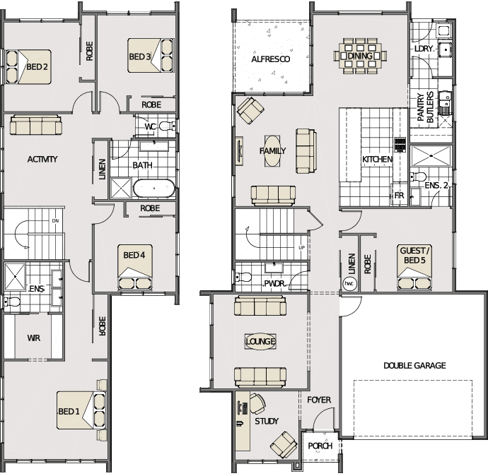 The Albany is a large, architecturally designed home ideal for growing families. With a 281 sqm floor it includes 5 bedrooms, 3 to 3.5 bathrooms, and a double garage. The layout is thoughtfully crafted to balance open-plan living with private retreats, and each roofline option offers a distinct aesthetic to suit different tastes and site conditions
