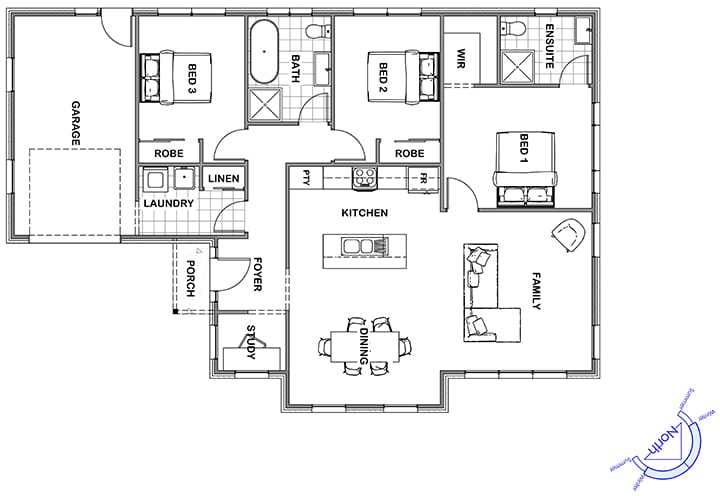 The Aura Gable stands out with its striking gable roofline, creating strong street appeal and architectural interest. The interior embraces natural light and open spaces, featuring a spacious open-plan living, dining, and kitchen area that opens to an alfresco, extending the living space outdoors. The master suite enjoys privacy with a generous ensuite and walk-in robe, while the children's wing includes two bedrooms, a shared bathroom, and an activity room, offering a practical layout for modern families.