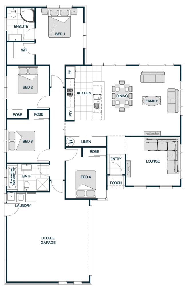 The Brighton Mono, soaring roof lines and pale exterior claddings give this home a perfect beach vibe. It is a beautifully designed home ideal for side-entry sites, offering a bright, open-plan layout that maximizes natural light and flow. With a floor area of 175m , it includes 4 bedrooms, 2 bathrooms, and a double garage. This home is perfect for families who love to entertain and enjoy spacious,