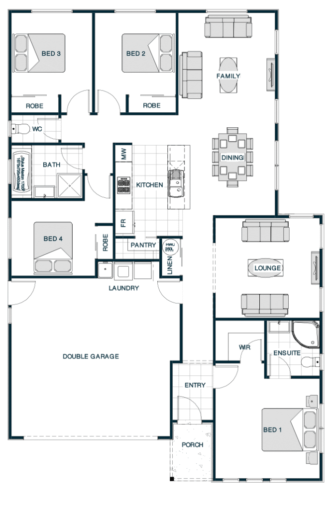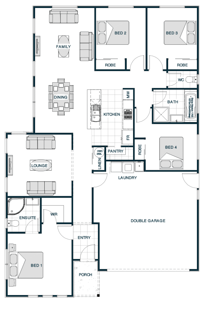 The Cambridge is a well-balanced, single-storey home designed to offer both privacy and spacious living. With a floor area of 175m, it includes 4 bedrooms, 2 bathrooms, and a double garage. Its layout is ideal for families who value separation between living and sleeping zones, with a stylish street frontage that suits a variety of sites.