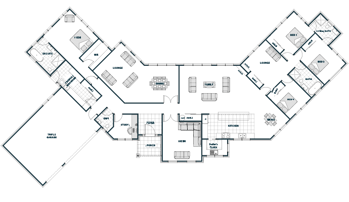 The Castle Park Mono is a modern,bold home featuring cube architecure to create strong clean lines, simple and strong. It is an expansive home designed for those who love to entertain and live large. With floor plans ranging from 365m to 496m , it includes 4 to 6 bedrooms, 3.5 bathrooms, and up to 4 living areas. Its distinctive layout features wings that curve inward, creating a sense of shelter, privacy, and architectural drama. This home is an entertainers dream with formal and casual dining options and great indoor, outdoor flow.