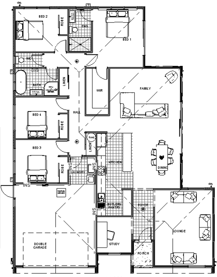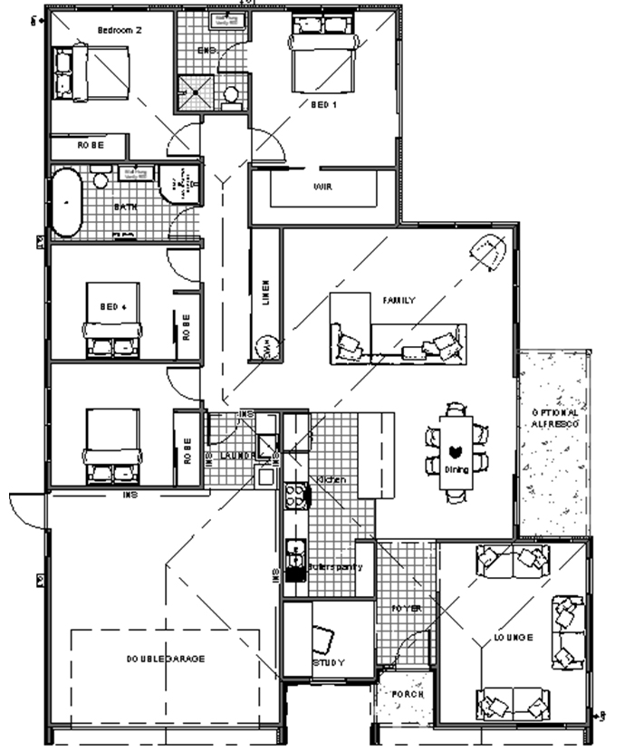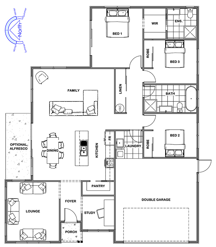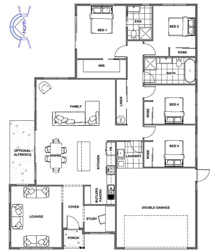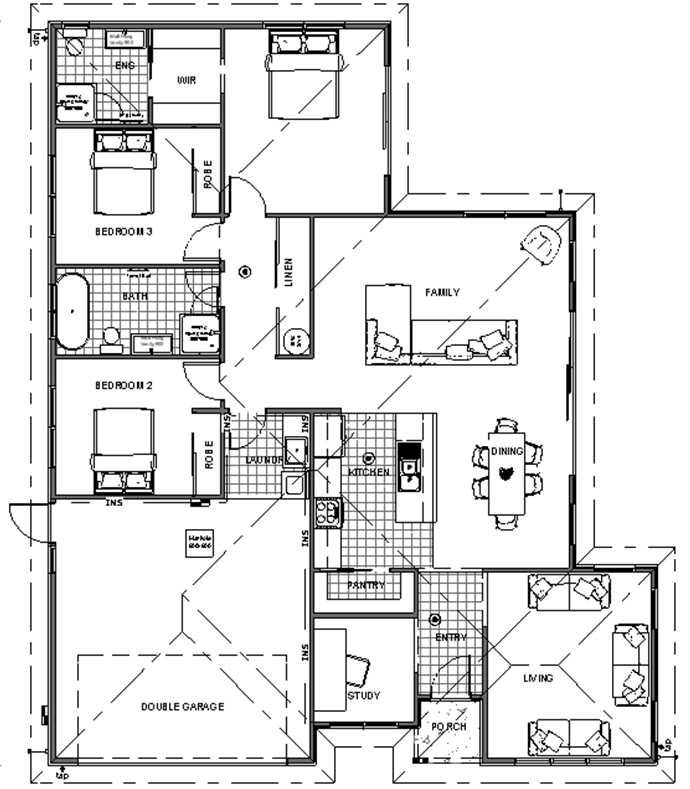 Crisp Gable rooflines give the Fairhill 2.0 a strong architectural presence. Vaulted ceilings enhance the open-plan living area, creating a light and airy environment. The kitchen anchors the space, flowing easily to outdoor areas. Four bedrooms, including a private master suite, are arranged to support modern family life.