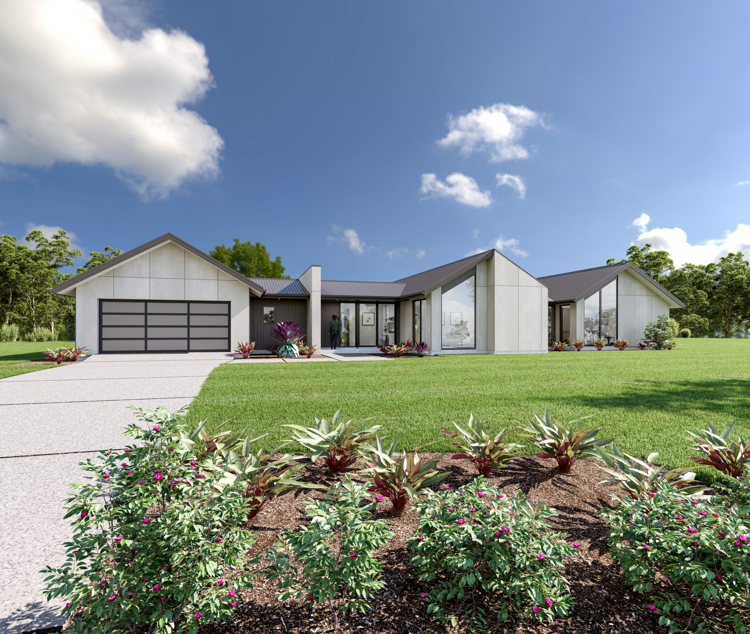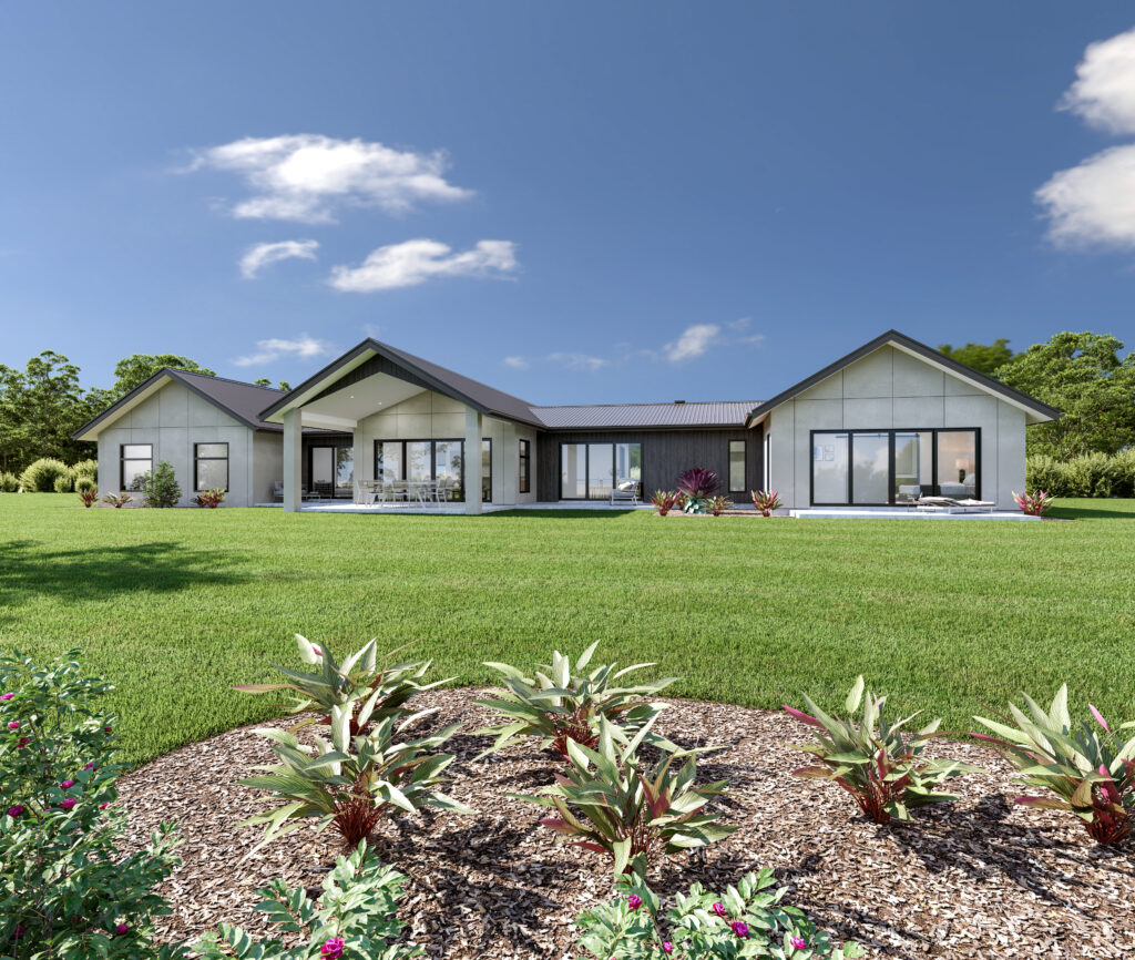 The Lodge facade showcases a stunning blend of cool, earthy tones and architectural sophistication with its distinctive triple gable roof lines. The bold feature wall at the entrance marks a striking focal point, creating a memorable first impression. This design seamlessly integrates natural hues with modern aesthetics, setting the stage for a home that is both inviting and impressive. Parents will love their fabulous private master suite beautifully located for all-day sun. While the kids will be equally happy with their separate wing that includes four - five bedrooms, two bathrooms, and a separate activity area.
