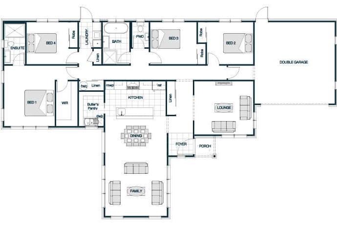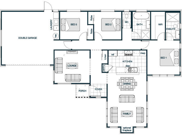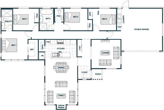 The Outlook Hip is a spacious and modern home designed to maximize comfort, light, and connection to the outdoors. With a total floor area of approximately 220m, it includes 4 bedrooms, 2 bathrooms, and a double garage, making it ideal for growing families or those who love to entertain.
