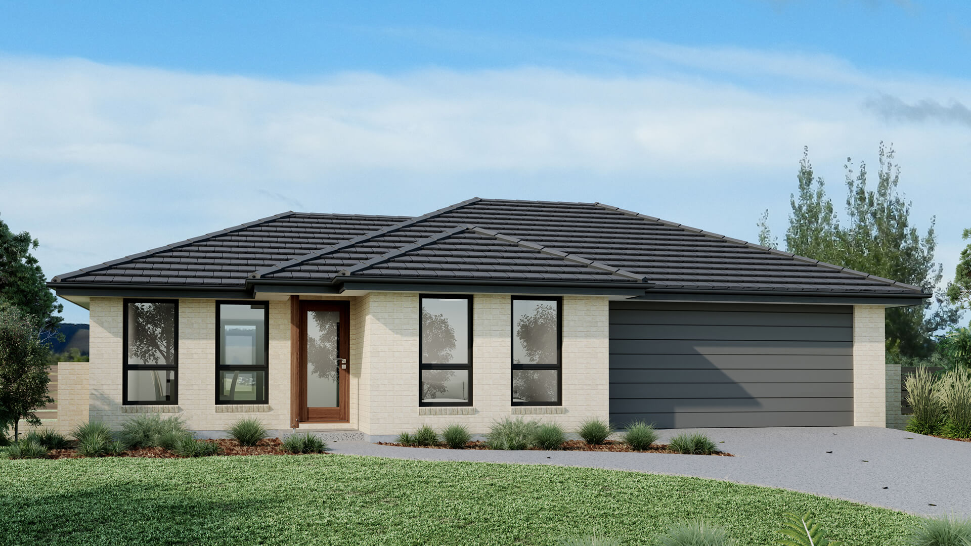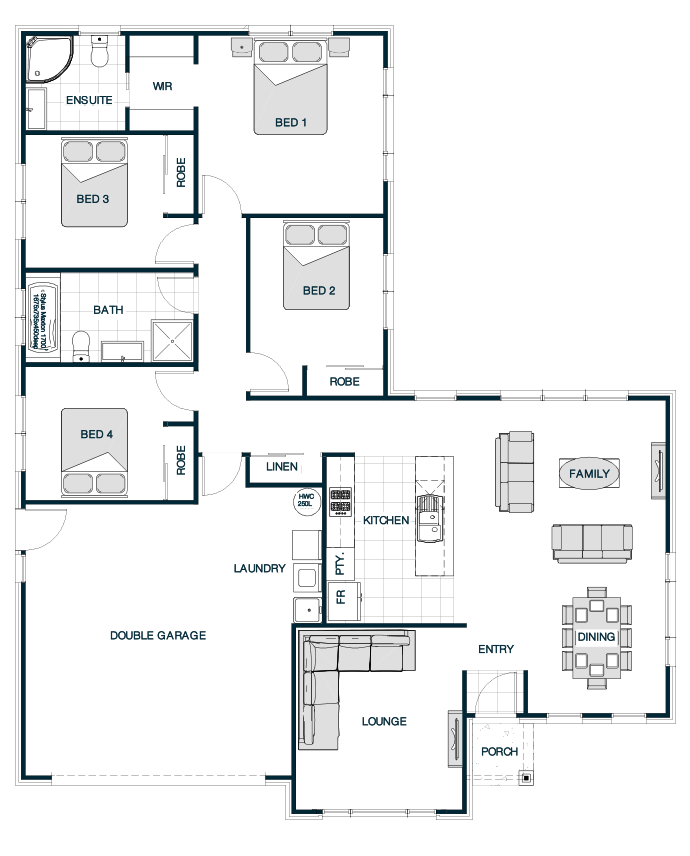 The Oxford Hip Roof plan combines durability and elegance with its four-sided roof design. This layout provides a balanced and symmetrical appearance, contributing to the home's timeless appeal. The open-plan living area serves as the heart of the home, connecting the kitchen, dining, and lounge spaces in a harmonious flow. With four bedrooms, including a master suite with an ensuite bathroom, the design caters to modern family living. The hip roof offers excellent protection against the elements and adds a refined touch to the home's overall aesthetic.