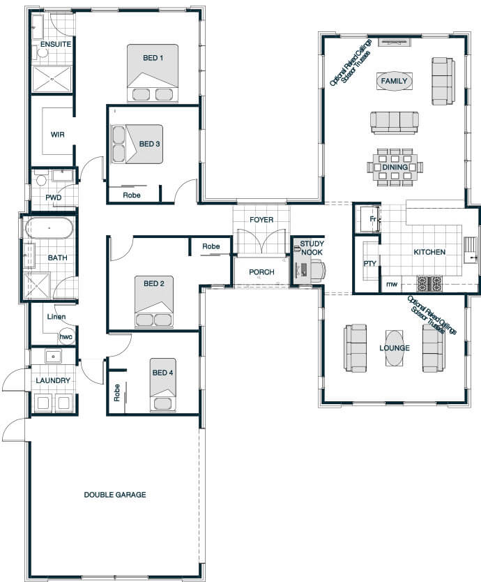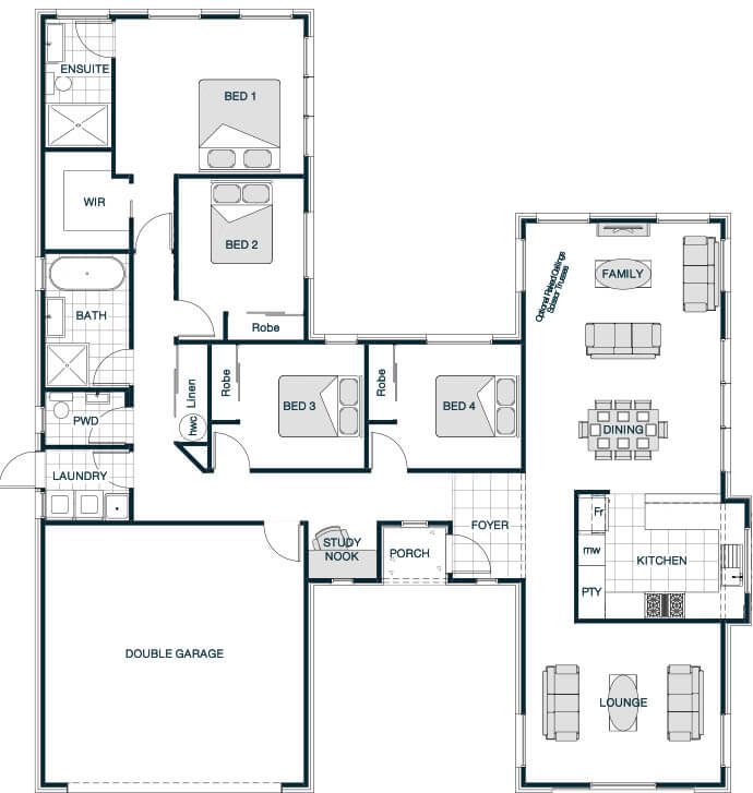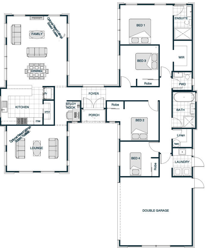 Our architects have developed this smart home with two separate and distinct wings. Formal and family lounges are positioned either side of a classic kitchen in one wing master and family bedrooms complete the other. A discreet study nook, separate laundry and separate laundry are also included