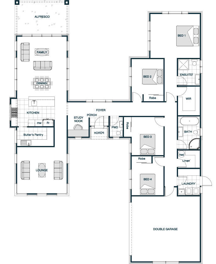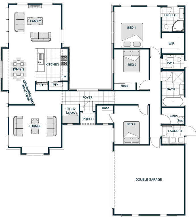 The Pavillion Hip is a classic, architecturally designed home that features two distinct wings, offering a smart layout ideal for both family living and entertaining. The traditional hip roof line and brick exterior gives this home a feeling of longevity and is very easy to maintain.