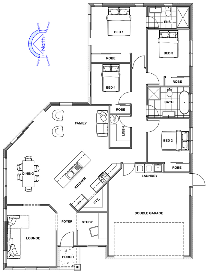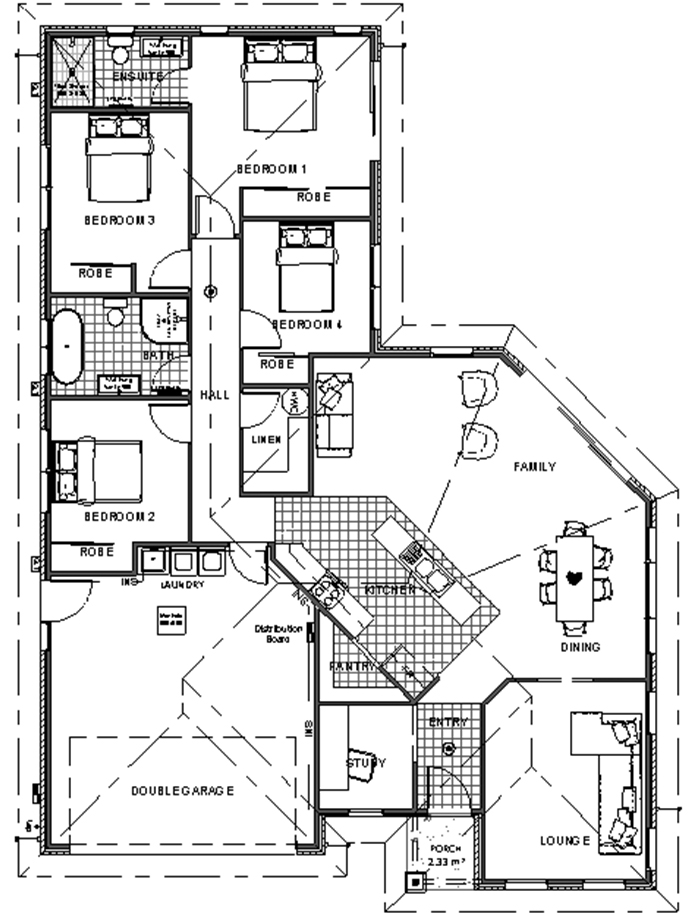 Radiating out from a modern galley style kitchen with spacious walk-in pantry, you get a sense of space as you walk through to the open plan family and dining area. Compact but clever, nothing is forgotten in the Renwick design. It includes a separate study and lounge room to the front of the home.