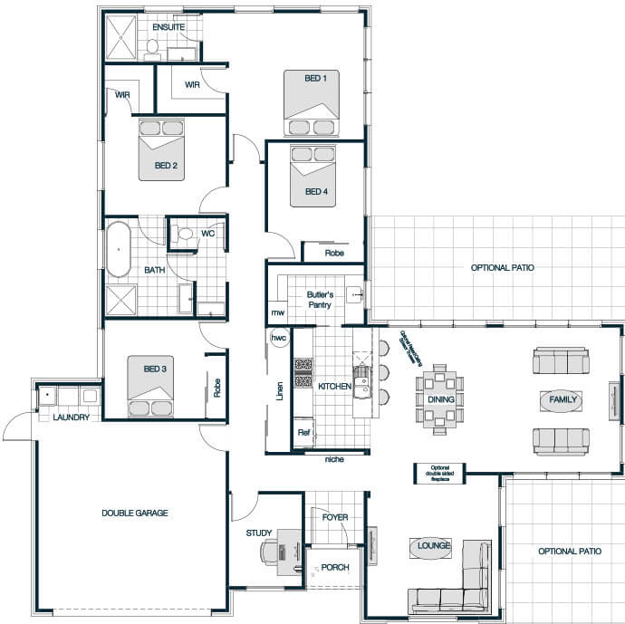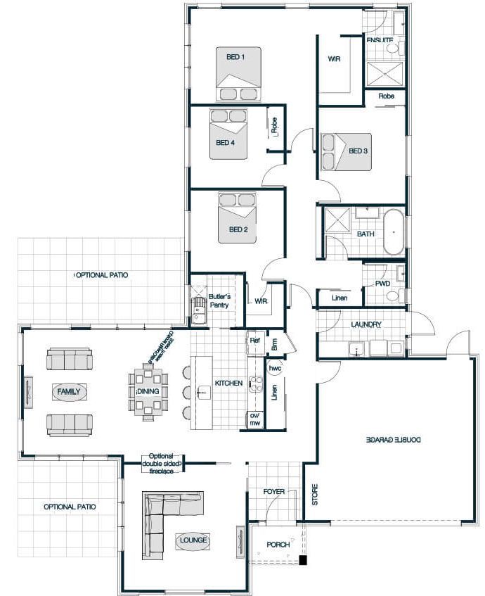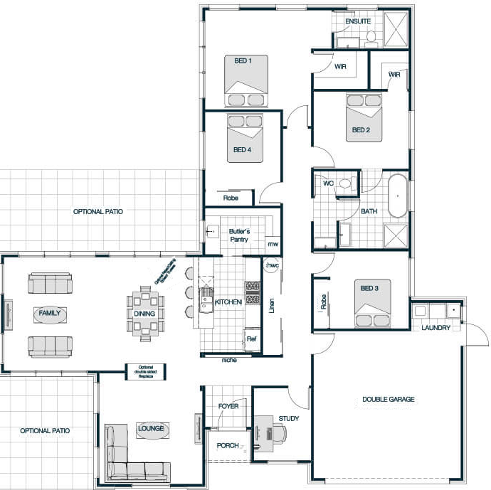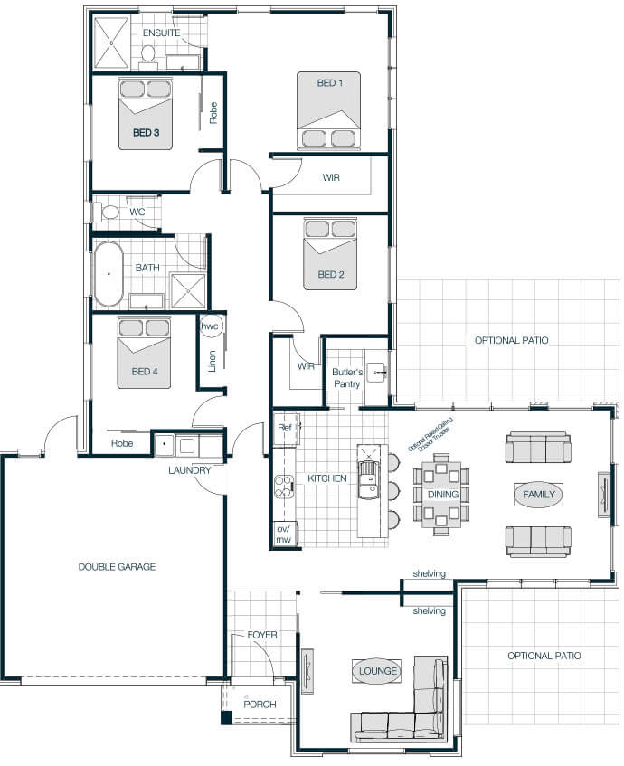 Balancing elegance with resilience, the Rosedale Hip Roof plan features a four-sided roof that offers strong protection from the elements while adding a refined, symmetrical aesthetic. Inside, the open-plan living zone is designed for easy living, with well-considered spaces for cooking, dining, and relaxing. The four bedrooms, including a master with ensuite, are arranged for privacy and comfort, ideal for families. This classic roof style complements the home's timeless appeal and ensures durability for years to come.