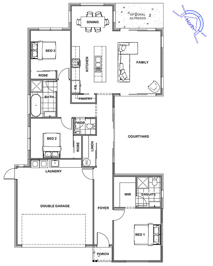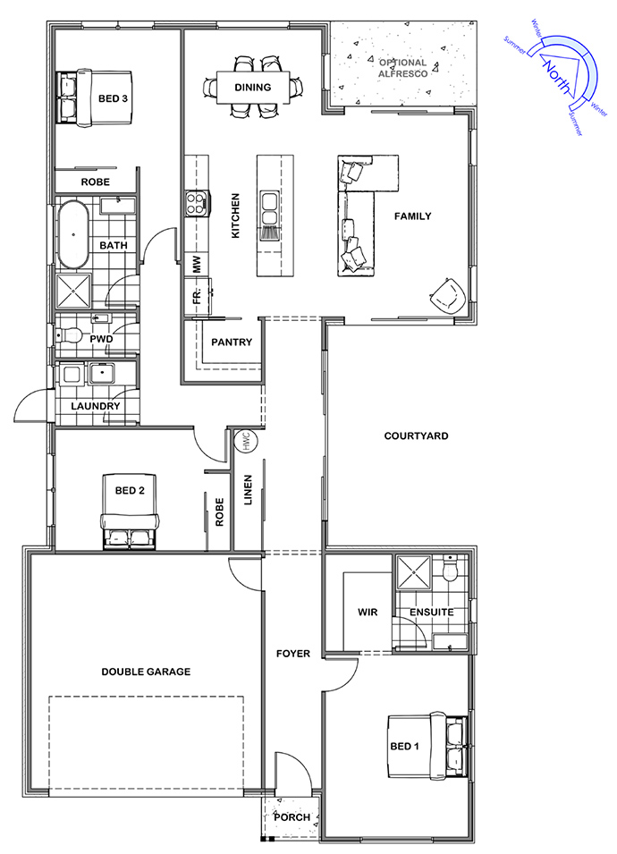 A striking and compact courtyard-styled home, the Seahaven is one of class and sophistication. With 3 4 bedroom options, a separate bathroom and a master suite, this home caters to those seeking the little pleasures. The central courtyard fills the home with an abundance of natural light and makes indoor outdoor entertaining a joy. With the large open plan main living area including a luxurious kitchen with a walk-in pantry, storage is in abundance throughout this home.