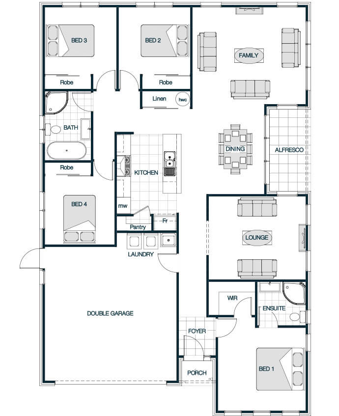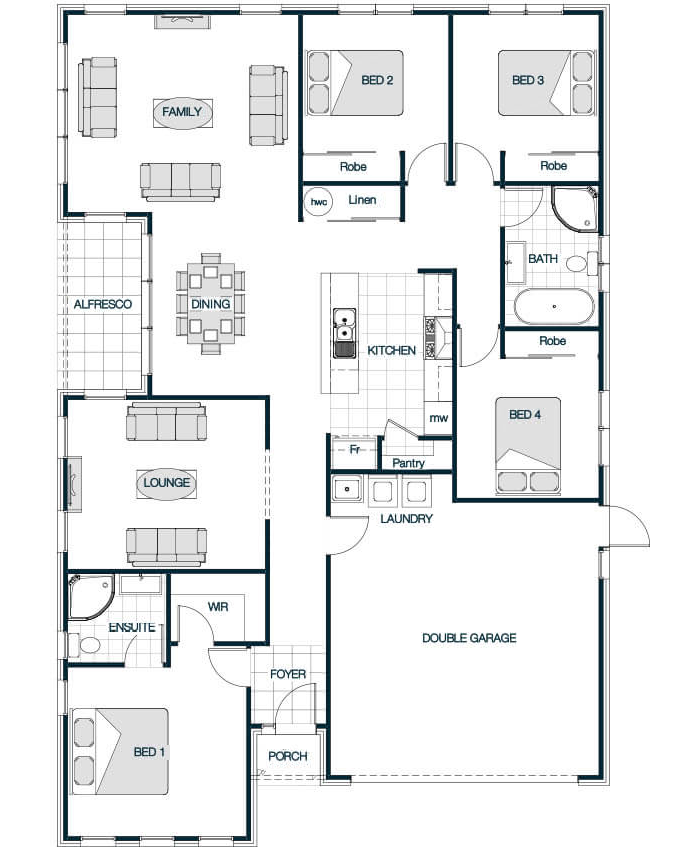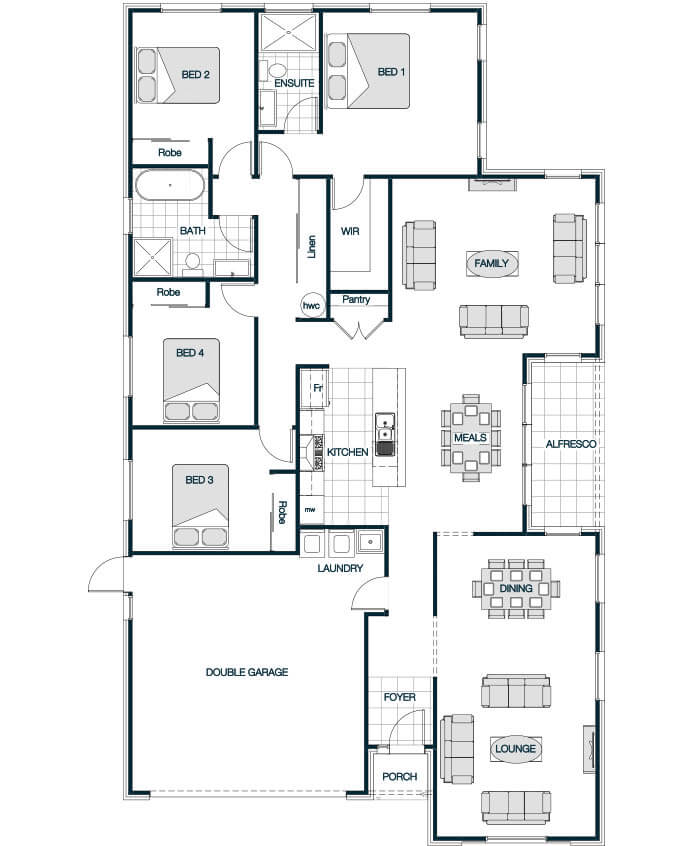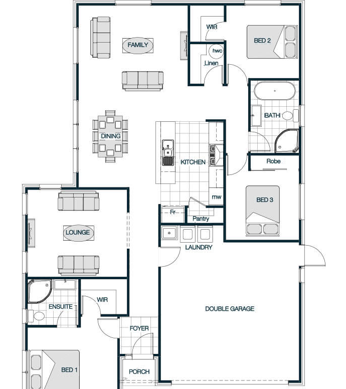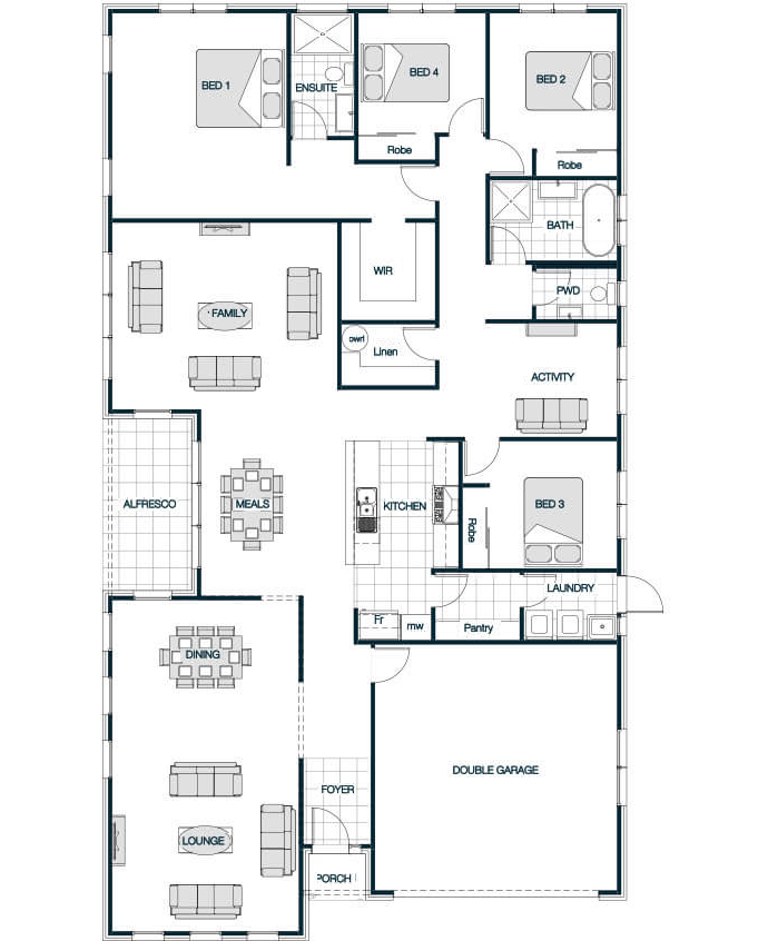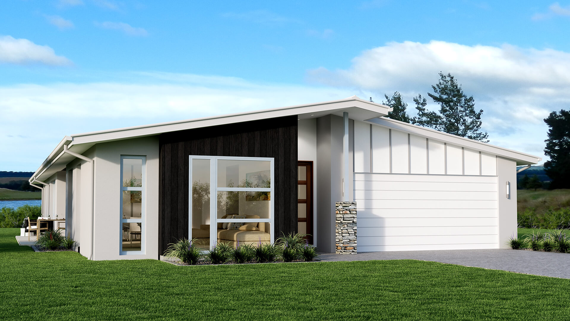 The Sorrento Mono is a luxurious and versatile home designed to suit a range of lifestyles and site sizes. With floor plans ranging from 175m to 264m, it typically includes 3 to 4 bedrooms, 2 to 2.5 bathrooms, and a double garage. The layout emphasizes open-plan living, privacy, and seamless indoor-outdoor flow. The Mono pitch roof line and high feature windows flood this home with light.