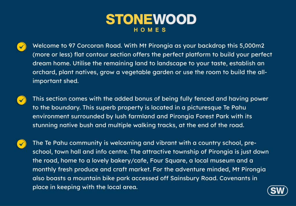 Positioned on a 5,000m² (more or less) flat, fully fenced section, the property offers plenty of space to create your dream lifestyle. Whether it’s establishing an orchard, planting native trees, creating a vegetable garden, or building that essential shed – the possibilities are endless. With power to the boundary, your build is ready to begin.