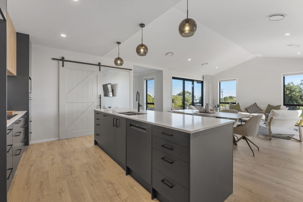 - Open plan living room with racked ceilings, onto a kwila deck alfresco area with overhead glazing.
